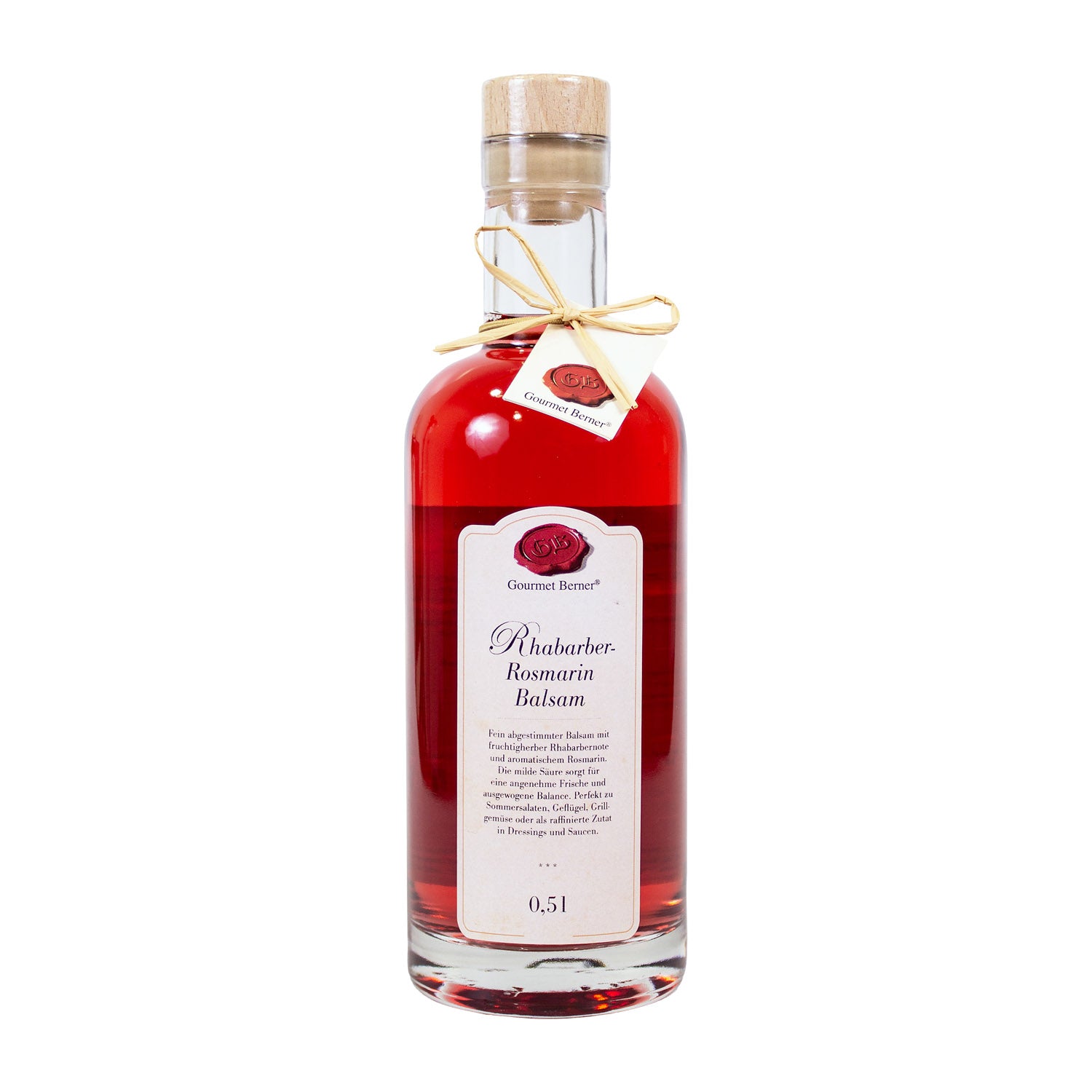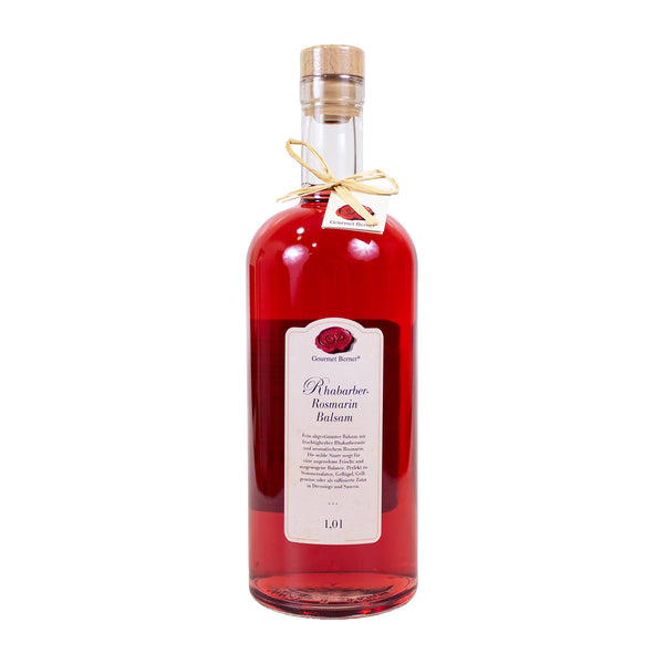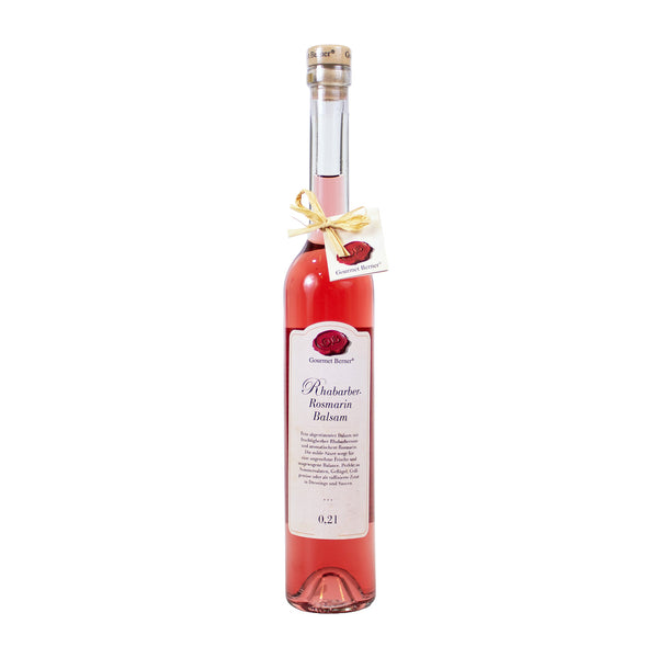 Fein abgestimmter Balsam mit fruchtigherber Rhabarbernote und aromatischem Rosmarin. Die milde Säure sorgt für eine angenehme Frische und ausgewogene Balance. Perfekt zu Sommersalaten, Geflügel, Grillgemüse oder als raffinierte Zutat in Dressings und Saucen.